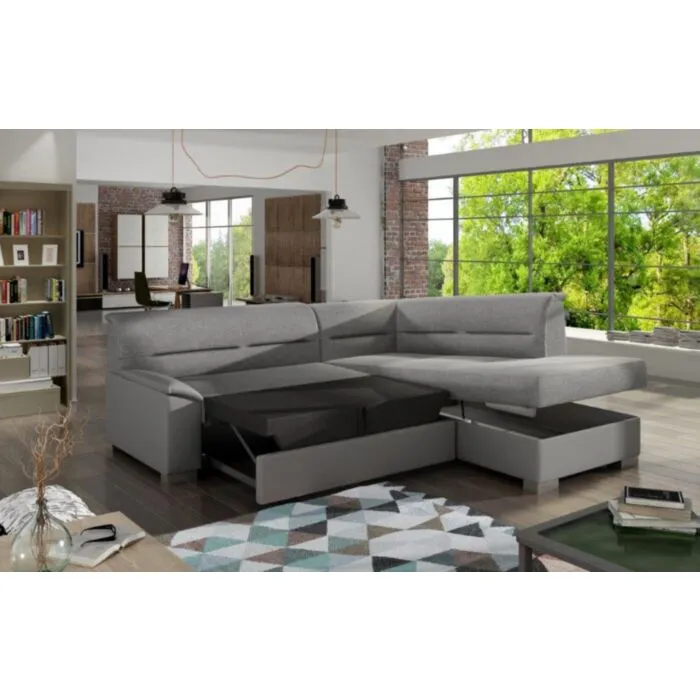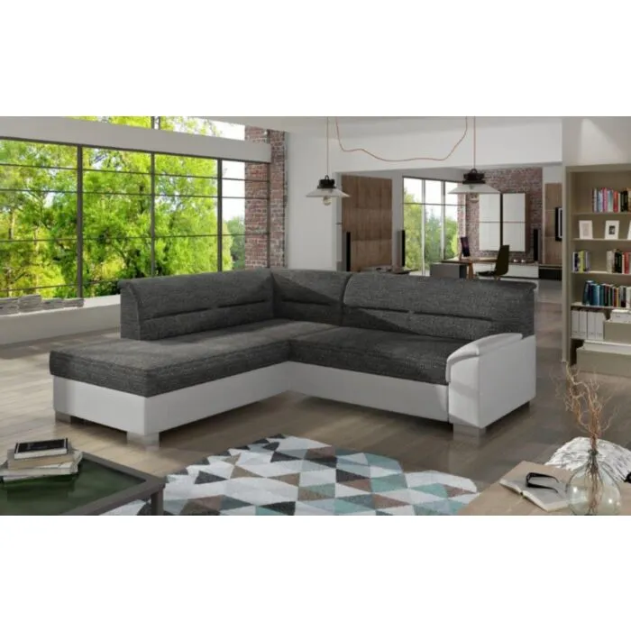 Kotna sedežna garnitura LIZIN 2 je narejena iz kvalitetnega materiala in dobavljiva po odlični ceni. Sedežna garnitura je narejena v kombinaciji blaga ter umetnega usnja. Garnitura se raztegne tudi v ležišče in vsebuje zaboj za shranjevanje posteljnine. Vzmetena je z valovitimi vzmetmi.