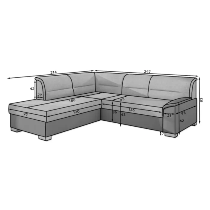 – D: 247 cm x G: 214 cm x V: 83 cm