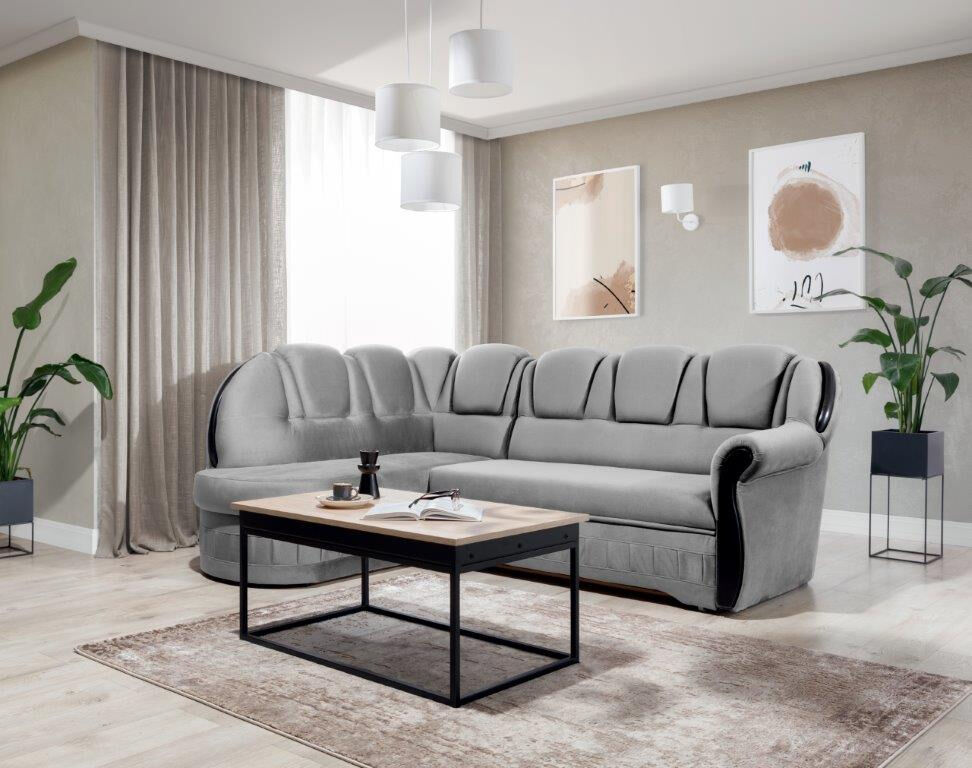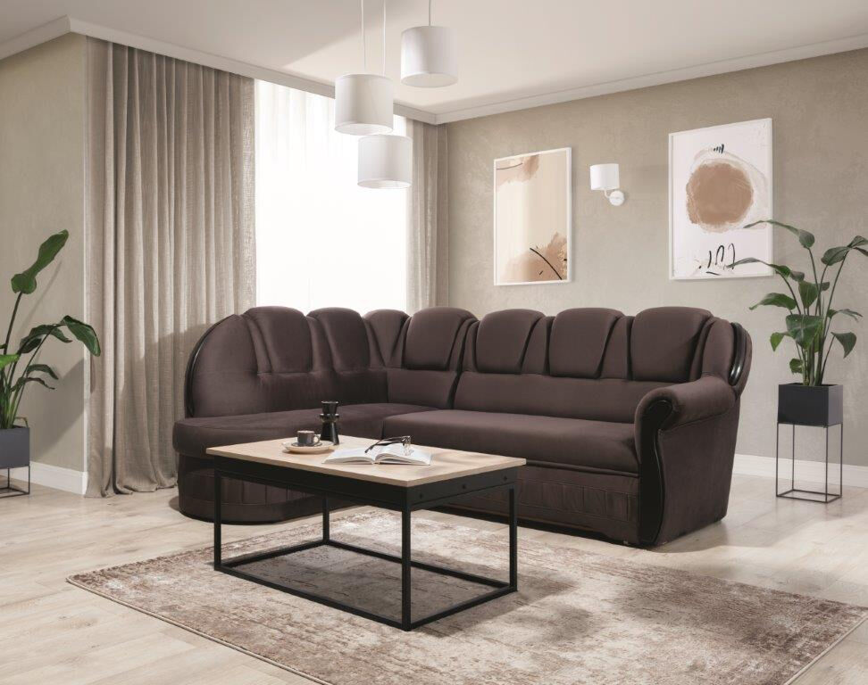 Kotna sedežna garnitura LOLA je izdelana iz kvalitetnega blaga. Je zelo praktična saj vsebuje zaboj za shranjevanje ter se raztegne v ležišče. Vzmetena je z valovitimi vzmetmi.
