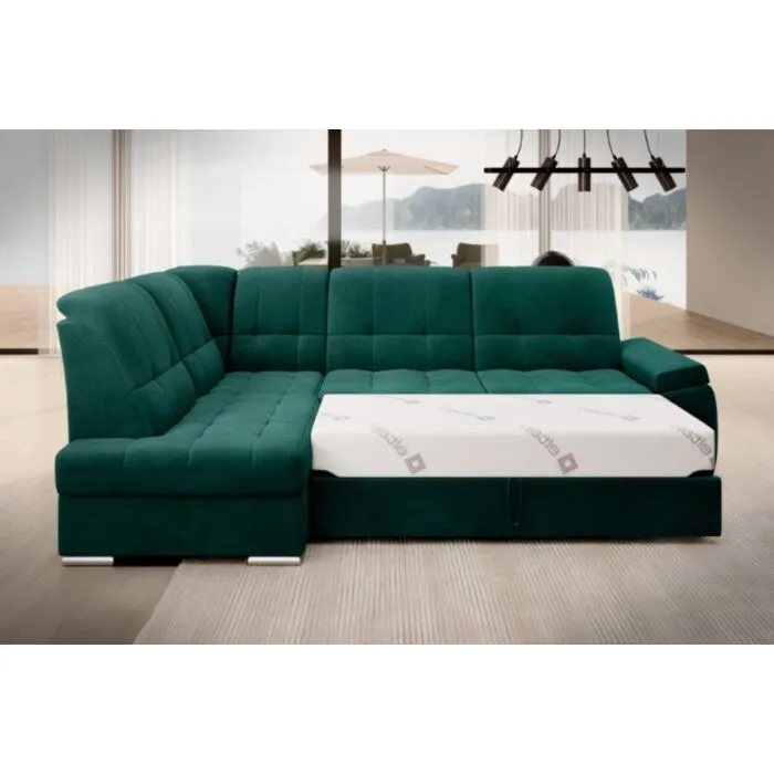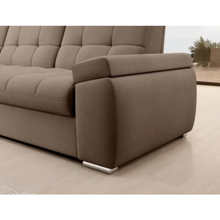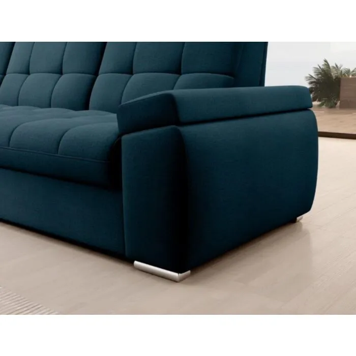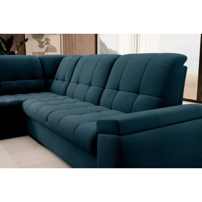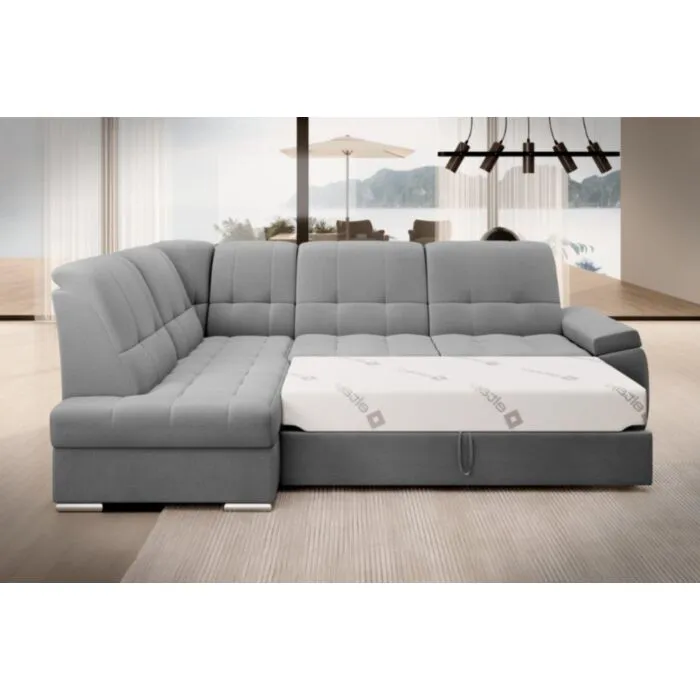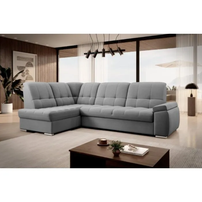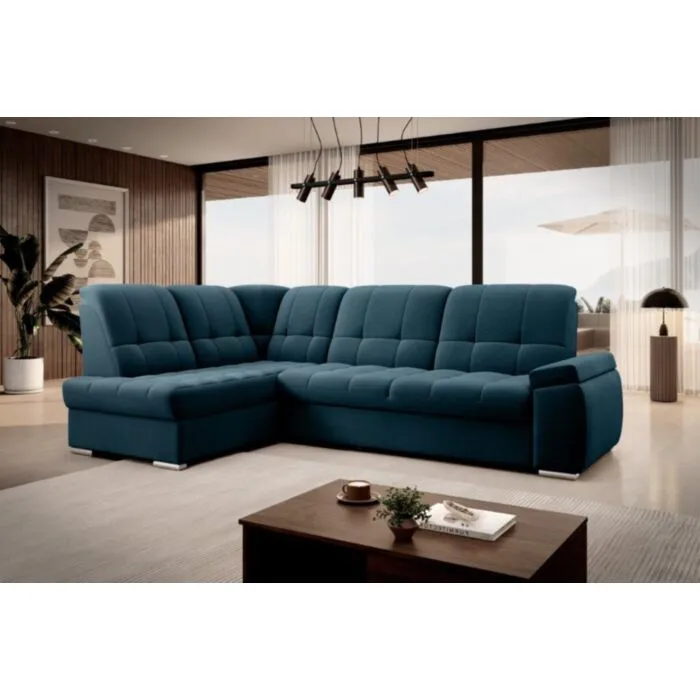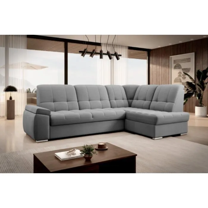Kotna sedežna garnitura MAT2 je narejena iz kvalitetnih materialov in dobavljiva v več različnih barvah. Ima nastavljiv naslon za hrbet. Garnitura je opremljena z dodatnim ležiščem katero se raztegne z dolphin mehanizmom. Prav tako vsebuje zaboj za shranjevanje. Nogice so elegantne v srebrni barvi, podale se bodo v vsako dnevno sobo. Sedežni morate določiti levi ali desni kot.