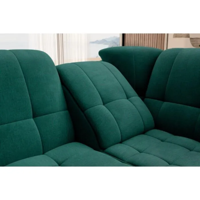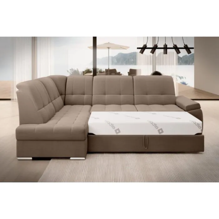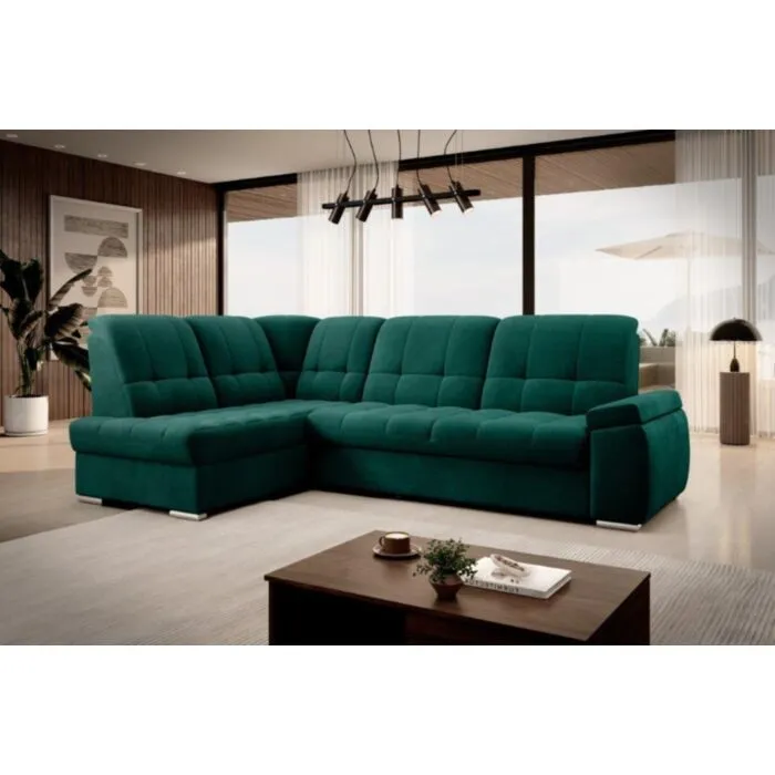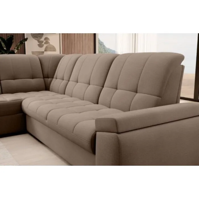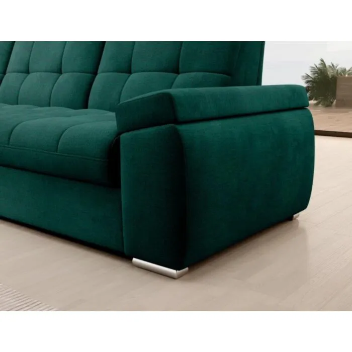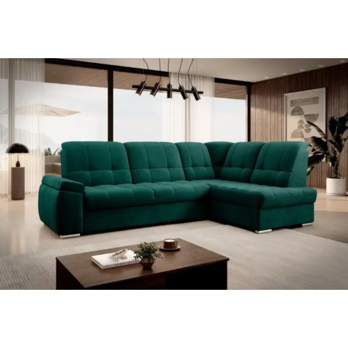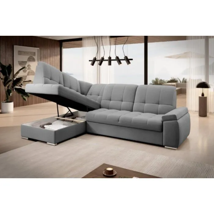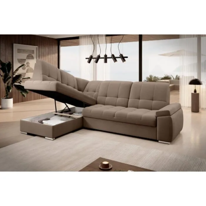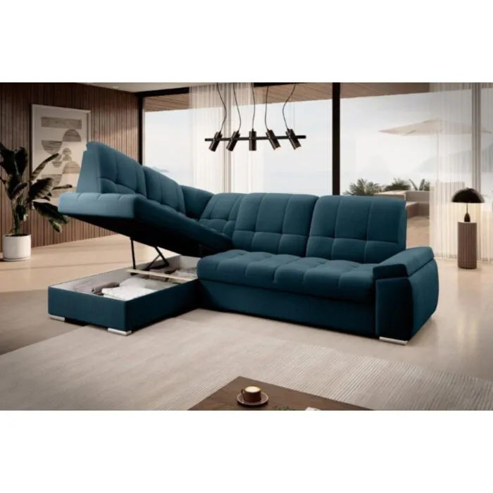 Kotna sedežna garnitura MAT2 je narejena iz kvalitetnih materialov in dobavljiva v več različnih barvah. Ima nastavljiv naslon za hrbet. Garnitura je opremljena z dodatnim ležiščem katero se raztegne z dolphin mehanizmom. Prav tako vsebuje zaboj za shranjevanje. Nogice so elegantne v srebrni barvi, podale se bodo v vsako dnevno sobo. Sedežni morate določiti levi ali desni kot.
