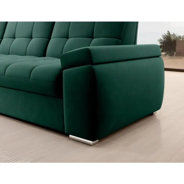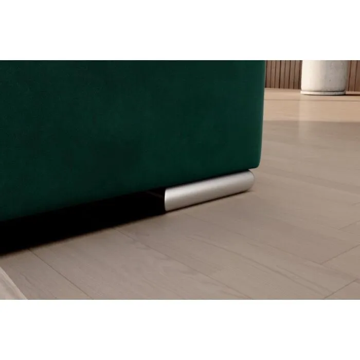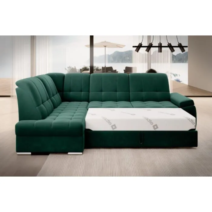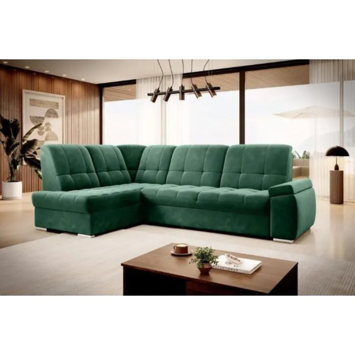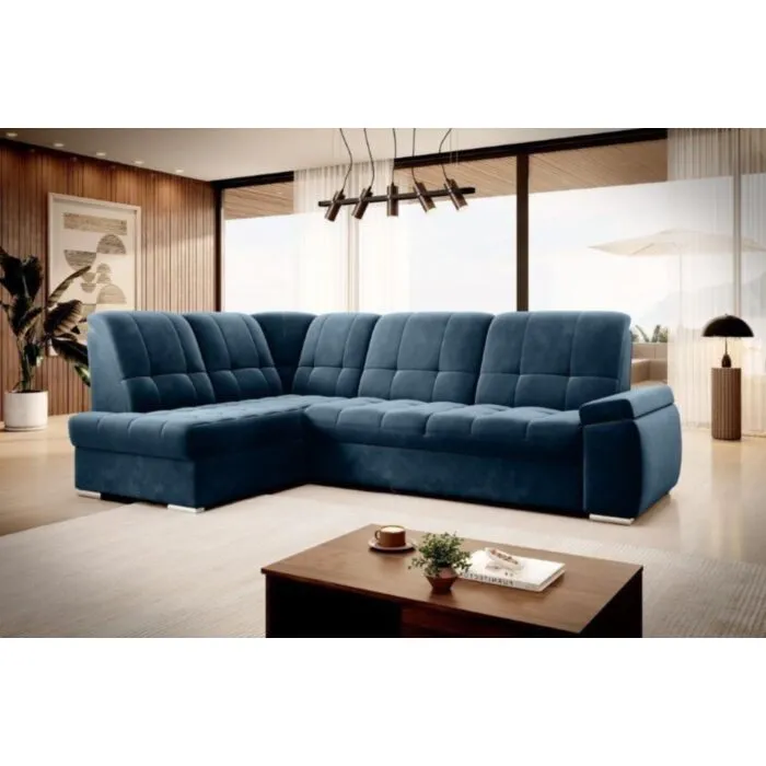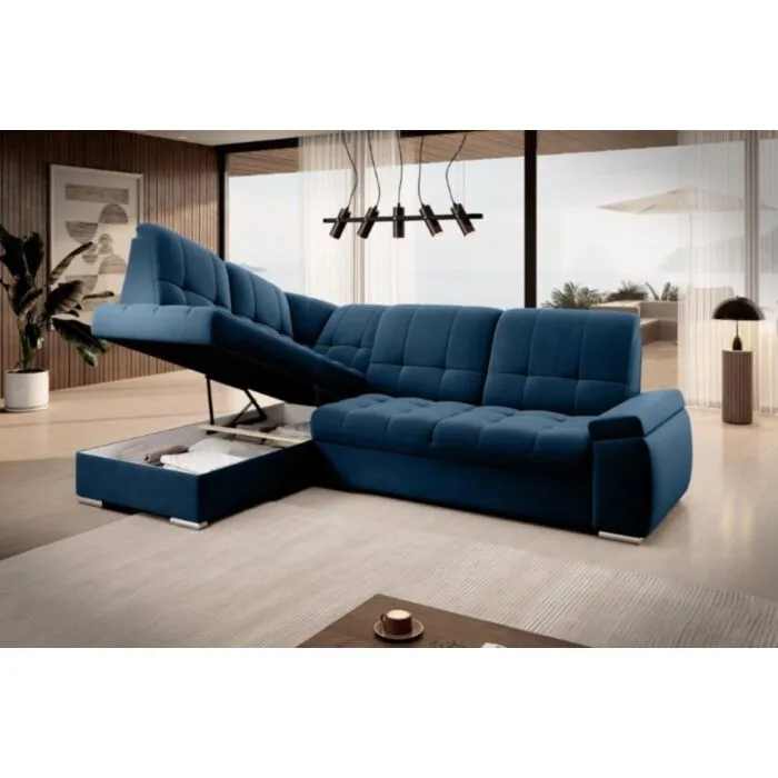 Kotna sedežna garnitura MAT je narejena iz kvalitetnih materialov in dobavljiva v več različnih barvah. Ima nastavljiv naslon za hrbet. Garnitura je opremljena z dodatnim ležiščem katero se raztegne z dolphin mehanizmom. Prav tako vsebuje zaboj za shranjevanje. Nogice so elegantne v srebrni barvi, podale se bodo v vsako dnevno sobo. Sedežni morate določiti levi ali desni kot.