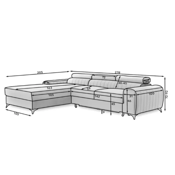 – D: 278 cm x G: 205 cm x V: 72 / 92 cm