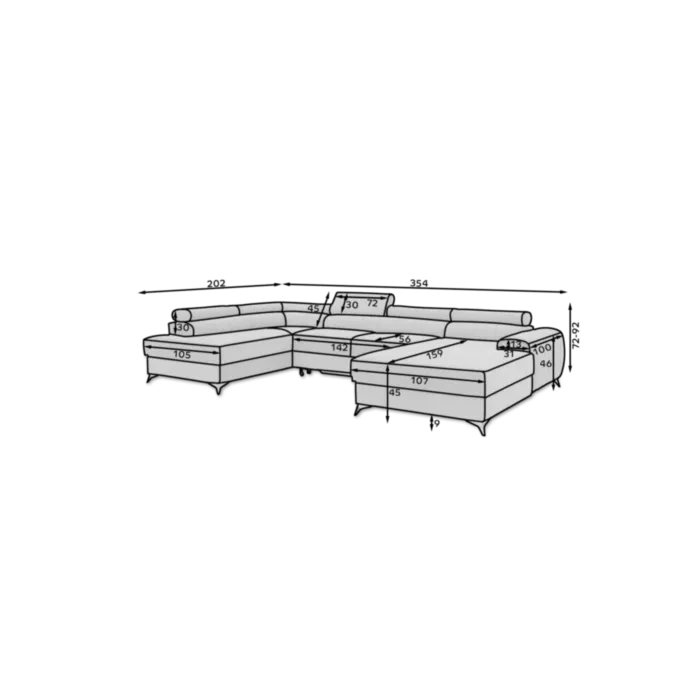 – D: 354 cm x G: 202 cm x V: 72 / 92 cm