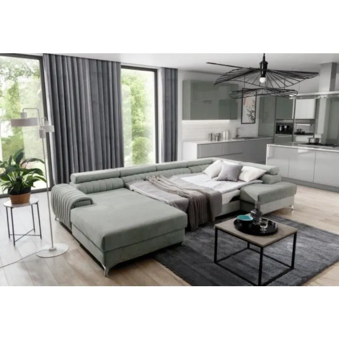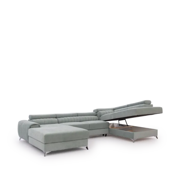 Kotna sedežna garnitura RASI dviguje nivo sodobnega bivalnega prostora, zahvaljujoč zanimivi obliki ter dizajnerskim jeklenim kromiranim nogam višine 9 cm. Kotna sedežna garnitura RASI je opremljena tudi z zabojem za posteljnino. Prednost je tudi spalna funkcija katera se raztegne z dolphin mehanizmom. Sedež je izdelan iz valovite vzmeti in kombinacije visoko elastične pene, ki bo zagotovo pripomogla k udobnemu počitku. Ne pozabimo na sodobne, nastavljive vzglavnike.