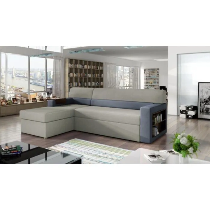 Kotna sedežna garnitura RIO 3 je odlična garnitura po odlični ceni. Izdelana je iz kakovostne tkanine. Sedežna je vzmetena z valovitimi vzmetmi. Sedežna je udobna saj se raztegne v dodadtno ležišče z delfin mehanizmom. Praktična je za uporabo saj vsebuje zaboj za shranjevanje kakor tudi poličke v rokonaslonu.