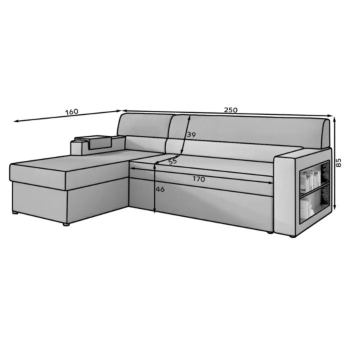 – D: 250 cm x G: 160 cm x V: 85 cm