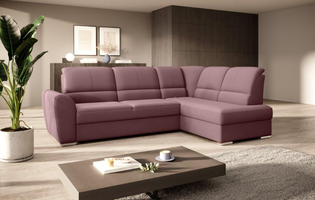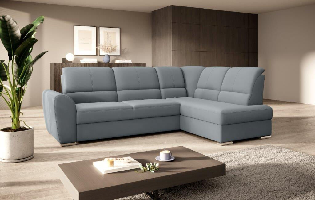Kotna sedežna garnitura VALLY 3 je sodobnega dizajna. Sedežna je praktična za uporabo, saj ima nastavljiv sredinski naslon za hrbet. Ima elegantne srebrne noge, zaboj za shranjevanje ter se raztegne v dodatno ležišče z mehanizmom delfin. Sedežna je vzmetena z valovitimi vzmetmi v kombinaciji poliuretanske pene.