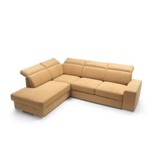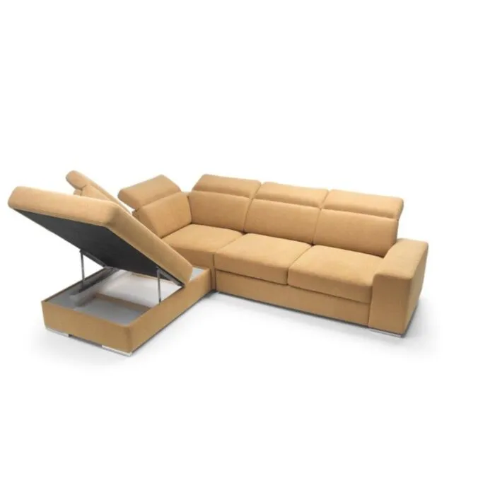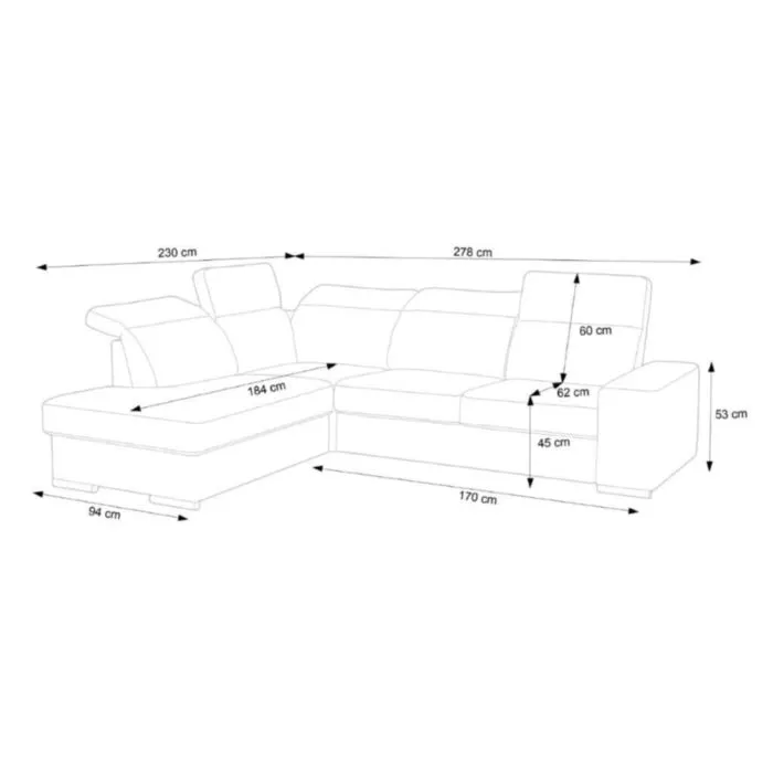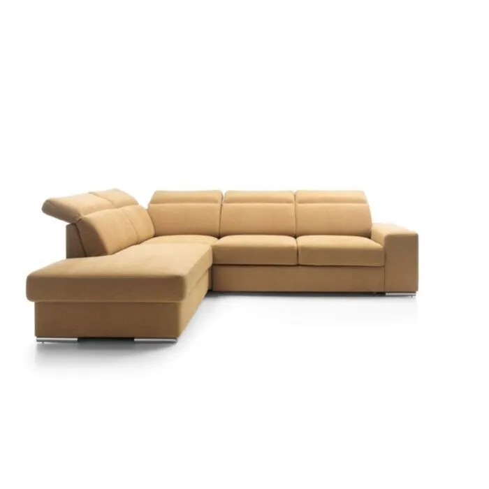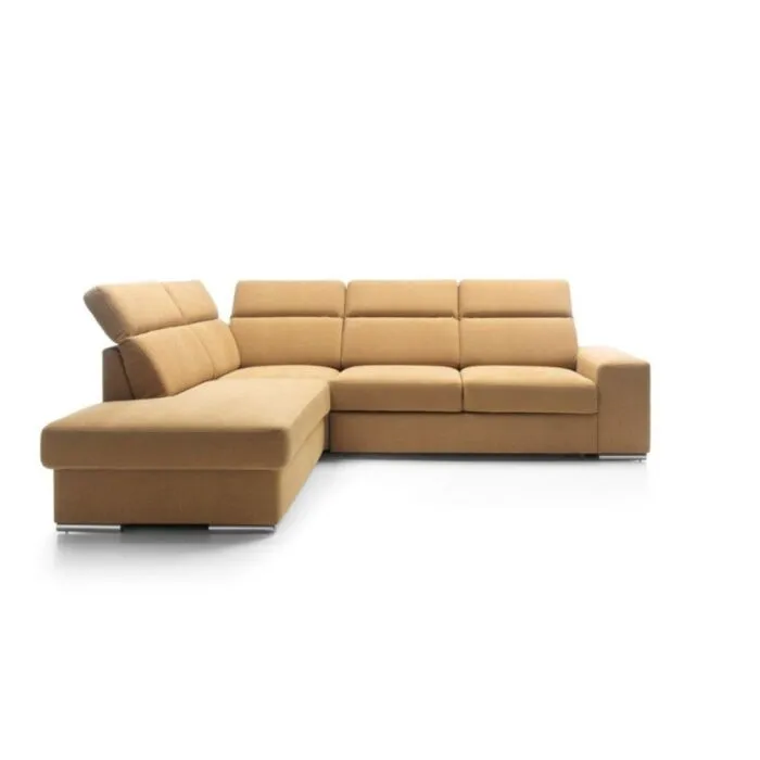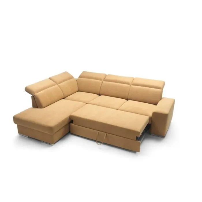 Kotna sedežna garnitura VANDI je narejena iz kvalitetne PUR pene z valovitimi vzmetmi. Ima oblazinjeno hrbtišče ter kromirane zaključne elemente in nastavljive vzglavnike. Vsebuje posodo za posteljnino ter dodatno ležišče s sistemom delfina. Garnituri je potrebno določiti levi ali desni kot.