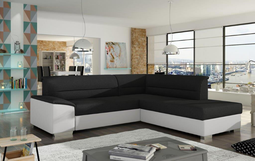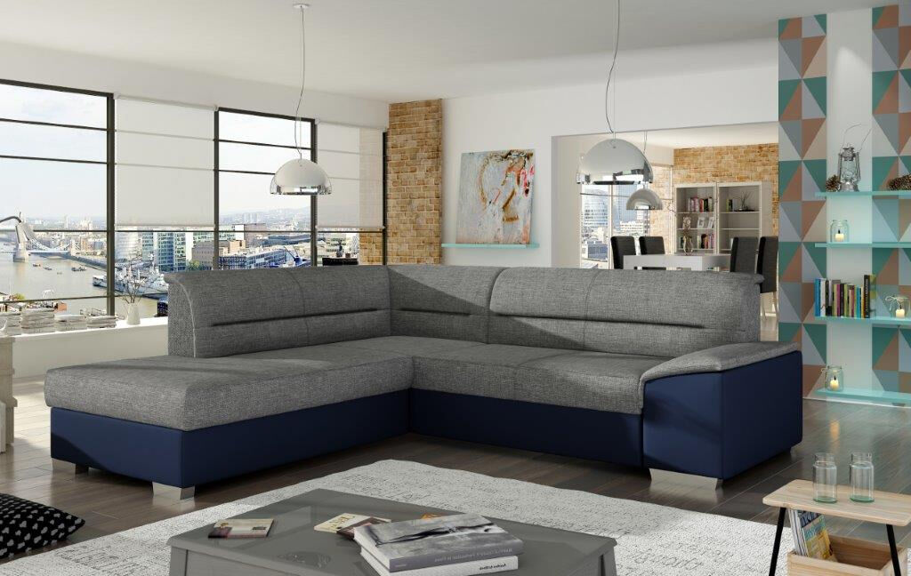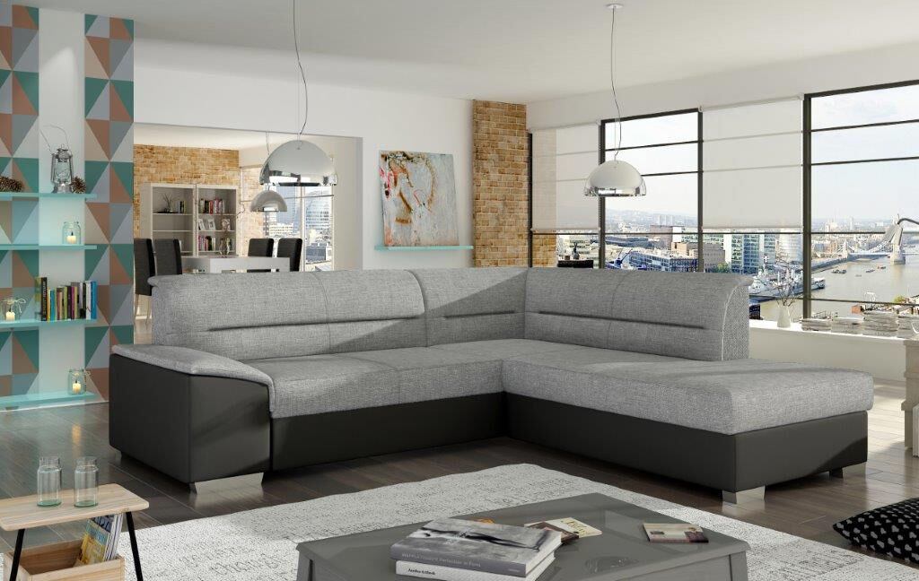 Kotna sedežna garnitura VERY 3 je odlična garnitura po odlični ceni. Izdelana je v kombinciji blaga ter umetnega usnja. Sedežna je vzmetena z valovitimi vzmetmi, ter se raztegne v dodatno ležišče z delfin mehanizmom. Sedežna vsebuje tudi zaboj za shranjevanje. Dizajn, kateri vas bo prepričal.