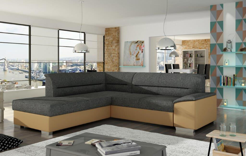 Kotna sedežna garnitura VERY 4 je odlična garnitura po odlični ceni. Izdelana je v kombinciji blaga ter umetnega usnja. Sedežna je vzmetena z valovitimi vzmetmi, ter se raztegne v dodatno ležišče z delfin mehanizmom. Sedežna vsebuje tudi zaboj za shranjevanje. Dizajn, kateri vas bo prepričal.