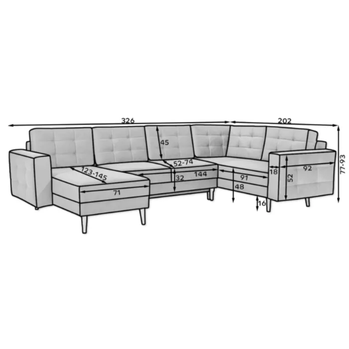 – D: 326 cm x G: 202 cm x V: 93 cm