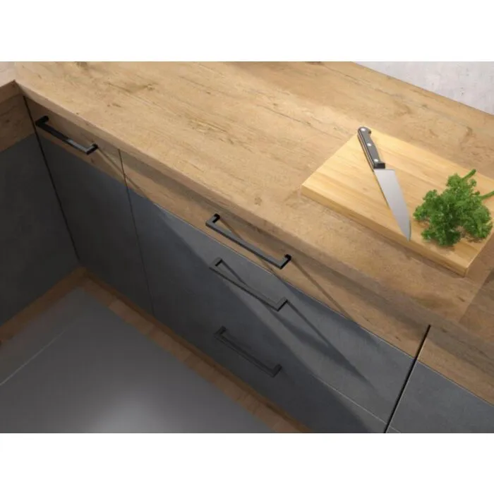 Kotna kuhinja PARIZ 210 x 350 cm je kuhinja, katera bo prinesla svežino v vaš dom. Dobavljiva je v moderni sivi hrast barvi. Debelina delovnega pulta je 28 mm. Kuhinja je izdelana iz oplemenitenih ivernih plošč debeline 16 mm in je oblečena v dekor, kateri jo ščiti pred vlago in ima visoko odpornost na praske. Kuhinja ima mehno zapiranje na vratih in predalih.