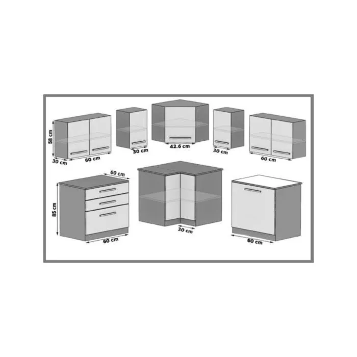 Eleganten kotni kuhinjski blok SENIDA, ki bo zagotovo osvežil vašo kuhinjo. Dobavljiv je v štirih različnih barvah kuhinjskih elementov. Delovni pult ni v enem kosu. V ceno je vključen le leseni del kuhinje. Možnost je naročiti sistem za mehko zapiranje vrat. Predali pa nimajo možnosti mehkega zapiranja.Debelina kuhinjskega pulta je 3cm. Stranice so v mat barvi, ličnice pa v visokem sijaju. Globina spodnje omarice 45 cm.