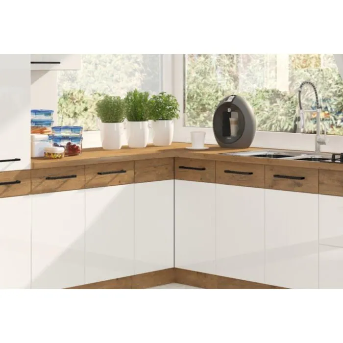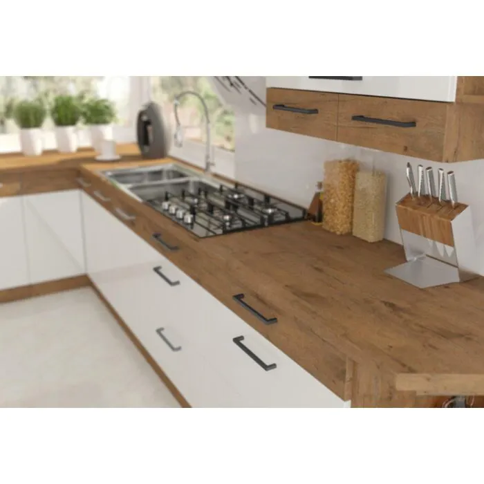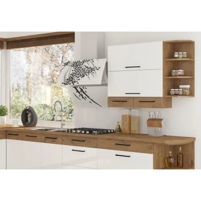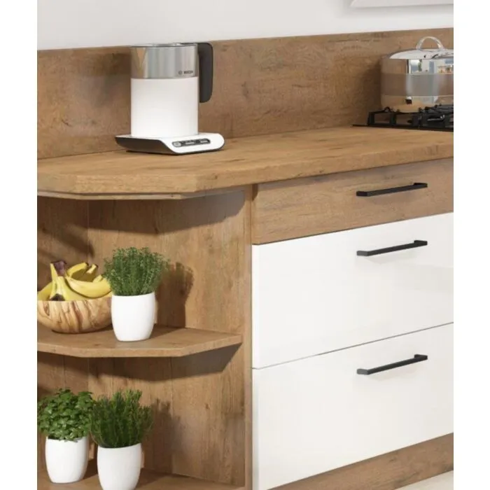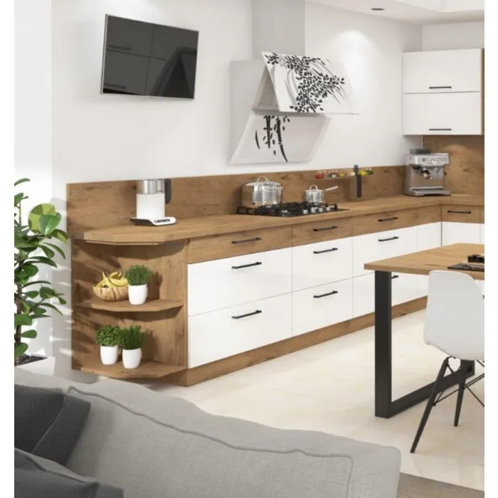 Kotni kuhinjski blok VANJA 330 x 340 cm je kuhinja, katera bo prinesla svežino v vaš dom. Dobavljiva v kombinaciji hrast/beli barvi. Možnost dobave tudi drugih dimenzij. Debelina delovnega pulta je 28 mm. Kuhinja je izdelana iz oplemenitenih ivernih plošč debeline 16 mm in je oblečena v dekor, kateri jo ščiti pred vlago in ima visoko odpornost na praske.