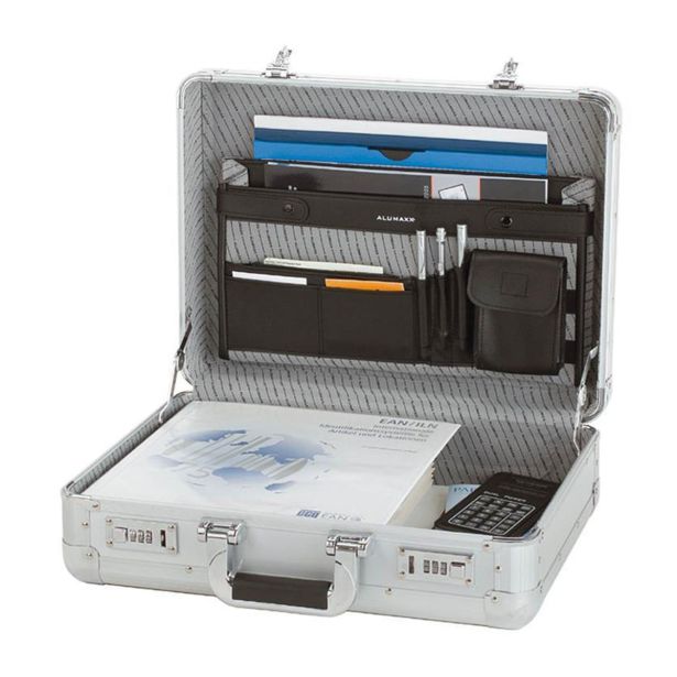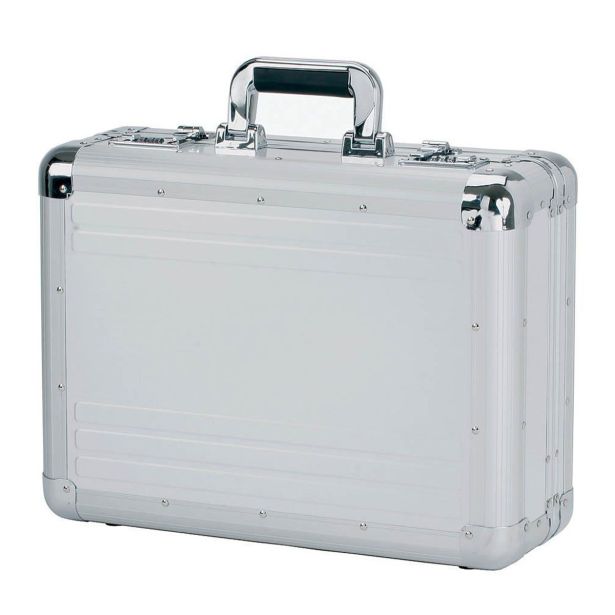 Eleganten aluminijast ataše kovček z ojačani robovi in ročajem, dvema ključavnica s številčnimi kombinacijami. V notranjosti snemljiv žep, tri zanke za pisala, žepki za vizitke in predali za dokumente A4. Zunanje dimenzije: 45,3 x 33,5 x 15 cm.
