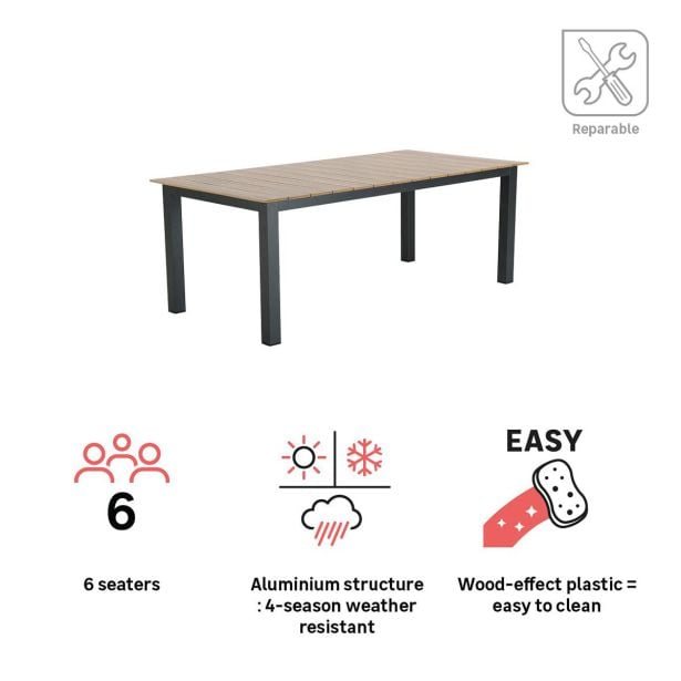 Miza Clara je praktična za vsakodnevno uporabo in enostavna za vzdrževanje. Njen sintetični les, ki ima videz pravega lesa, zahteva minimalno vzdrževanje. Vlažna krpa in Marsejski milo sta dovolj za obnovo sijaja, prav tako aluminijasta konstrukcija. Pozimi ne pozabite zaščititi mize s prepustno prevleko, da jo zaščitite pred slabim vremenom. Miza je popravljiva, rezervni deli so na voljo za podaljšanje življenjske dobe vašega pohištva.