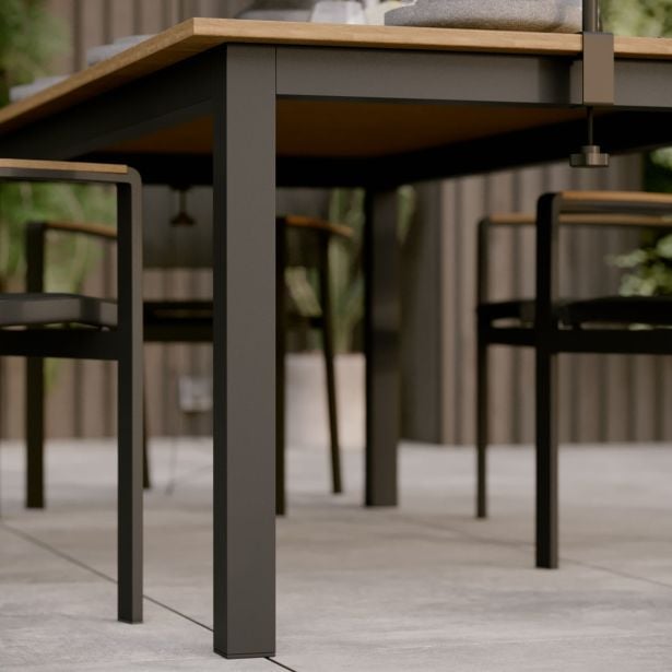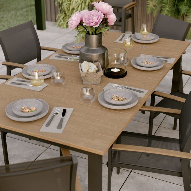 Kombinacija naravnosti in modernosti, serija Clara s svojo mešanico antracitnega aluminija in sintetičnega lesa ponuja topel in moderen čar vaši terasi, ustvarja industrijski videz. Njene geometrijske oblike še dodatno poudarjajo njen sodoben izgled. Za harmoničen jedilni prostor združite to mizo s stoli iz serije Clara, kotiščnim vrtnim pohištvom ter drugimi kosi pohištva iz te serije, da podaljšate obrok z trenutkom sprostitve.