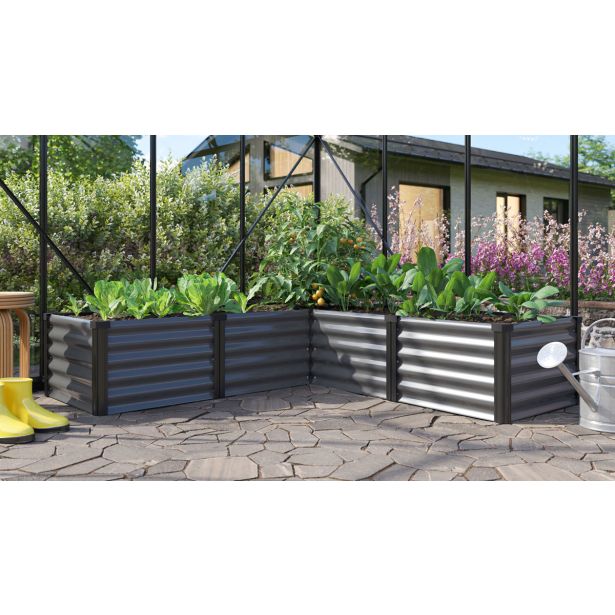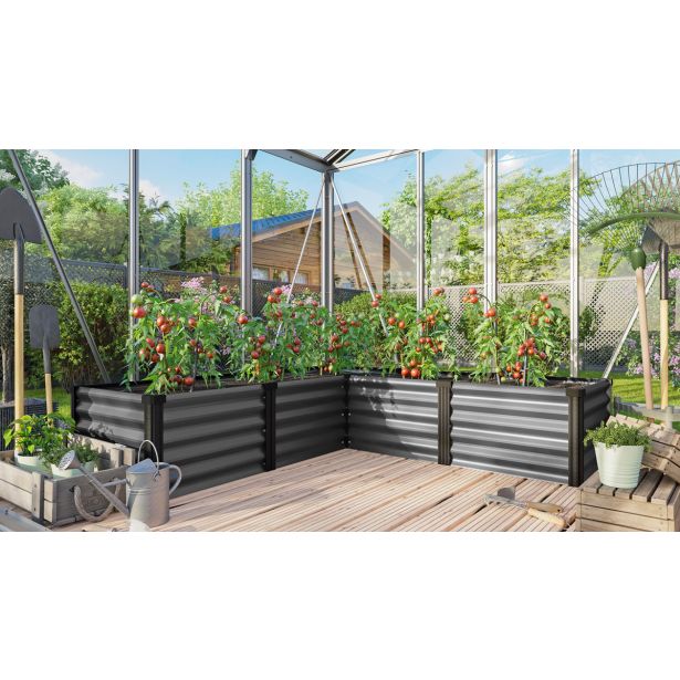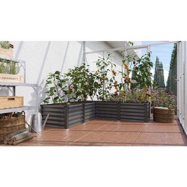 Dvignjene gredice Vitavia iz serije In&Out ponujajo rahlo dvignjeno delovno površino zahvaljujoč svoji višini 40 cm – tako da lahko tudi globoko ukoreninjene rastline najdejo dovolj zemlje, da se dobro oprimejo in dobijo dovolj hranil. Ciljno plastenje tal lahko optimizira pogoje tal. Format gredic In&Out je prilagojen standardnim širinam rastlinjakov Vitavia, tako da se optimalno prilegajo na zadnji konec ali – v obliki črke L (velikost M) – v zadnji kot rastlinjakov. Tabela (glej spodaj) nudi pregled primernih formatov za standardne modele rastlinjakov. Ležišča In&Out, izdelana iz izjemno odpornega na vremenske razmere Zincalume, so prav tako primerna za uporabo na prostem. V nasprotju z lesenimi posteljami ne potrebujejo notranje folije. Linus IN&OUT je na voljo v treh velikostih: S, M in L, kjer je M v obliki črke L, drugi dve pa imata klasično pravokotno obliko. Nove dvižne gredice IN&OUT v barvi granit ali morska trava v kombinaciji z delikatnimi aluminijastimi profili (opcijsko eloksiranimi v aluminiju ali črno prašno lakiranimi) se diskretno zlijejo s skoraj vsakim rastlinjakom Vitavia in modernim vrtom. Posamezni moduli, vključeni v komplet, so vnaprej izrezani in povezovalni deli so predhodno izvrtani.