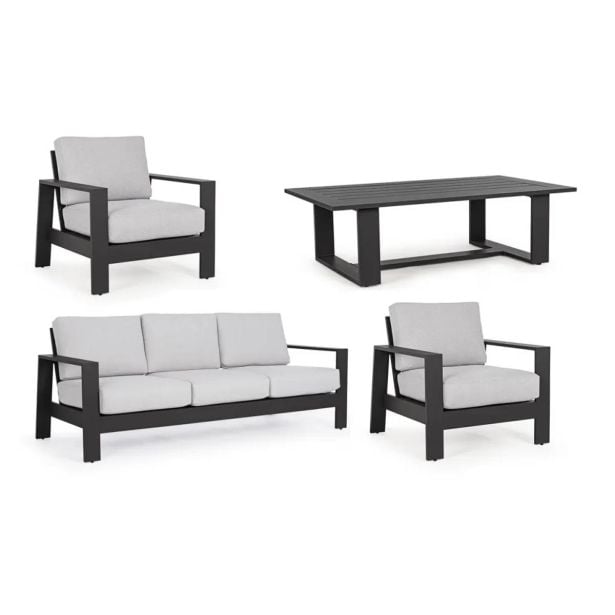 Material okvirja: Prašno barvan aluminij. Material prevleke blazine za sedišče/hrbet (snemljiva): Olefinska tkanina. Material okovja: Nerjaveče jeklo. Noge so nastavljive po višini. Dimenzije kavča: Širina 206 cm x Globina sedišča 85.5 cm x Skupna višina 83 cm x Višina sedišča od tal 39.5 cm x Višina naslonjala za roke od tal 59 cm x Višina naslonjala (brez blazin) od tal 76 cm Dimenzije fotelja: Širina 82 cm x Globina sedišča 85.5 cm x Skupna višina 83 cm x Višina sedišča od tal 39.5 cm x Višina naslonjala za roke od tal 59 cm x Višina naslonjala (brez blazin) od tal 76 cm Dimenzije mize: Dolžina 130 cm x Globina sedišča 73.5 cm x Višina 38 cm