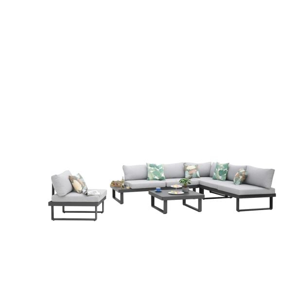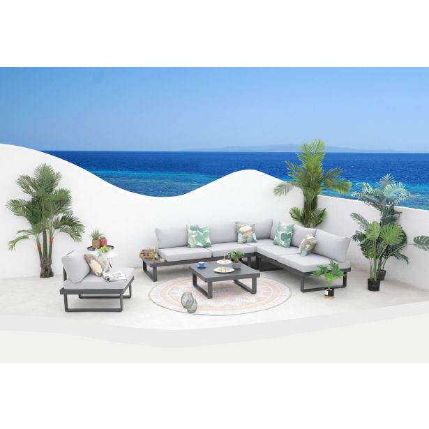Kovinska vrtna garnitura Green Valley Potenza je 5-delna vrtna garnitura, ki jo sestavlja en ssamostojni fotel in sestavljava vrtna klop iz dveh delov. Vrtna garnitura ima priložene blazine v svetlo sivi barvi.
