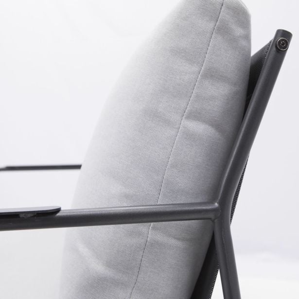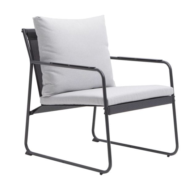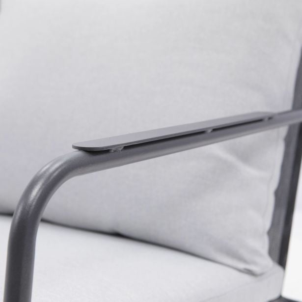Fino vrtno pohištvo, izdelano iz tankega jekla in zaobljenih robov, se ponaša z moderno estetiko in praktičnostjo. Poliesterske blazine nudijo izjemno udobje, ki ga dodatno okrepi naslonjalo naslonjačev in dvoseda, medtem ko nizke mizice dodajajo praktičen in eleganten pridih celotni postavitvi.