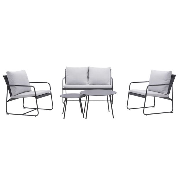 Idealno za terase ali majhne balkone, je fino vrtno pohištvo popolno za sprejem vaših gostov. Sestavljeno iz dvoseda, dveh naslonjačev in dveh nizkih miz, je to pohištvo primerno za sprejem do 4 ljudi. Zasnovano iz jekla, celotna postavitev je enostavna za premikanje glede na število gostov in preprosta za čiščenje. Neskončne noge, ki so vključene, omogočajo prilagoditev za optimizacijo prostora ali pa jih postavite po vaši želji, da imate pijačo vedno pri roki. Komplet je opremljen z blazinami iz poliestra za optimalno udobje.
