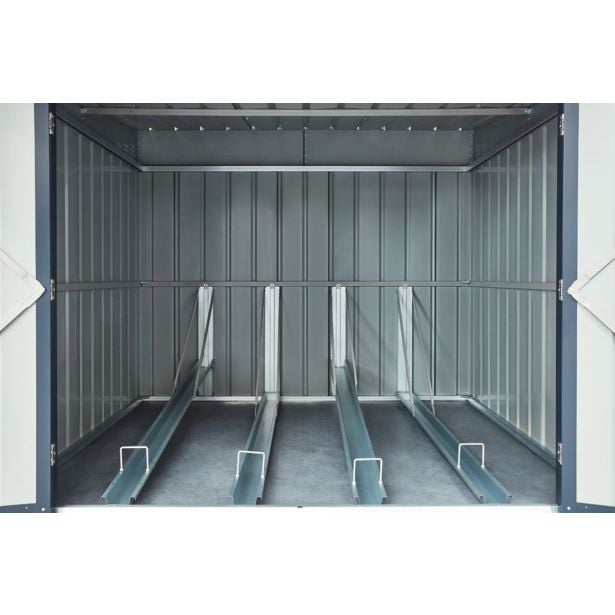 Premium garaža za kolesa Family nudi varen prostor za parkiranje doštirih koles dolžine najv. 1,83 m. Vsebovane tirnice omogočajo izjemnohitro parkiranje in izvoz ter učinkovito rabo prostora.