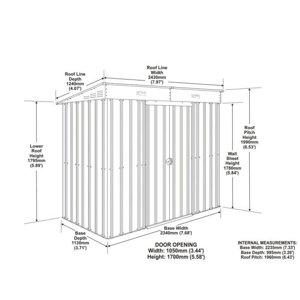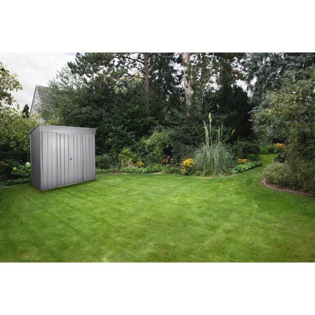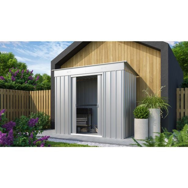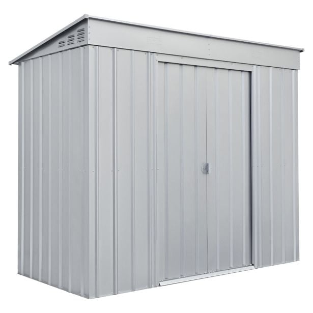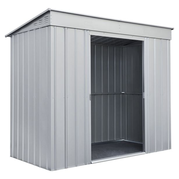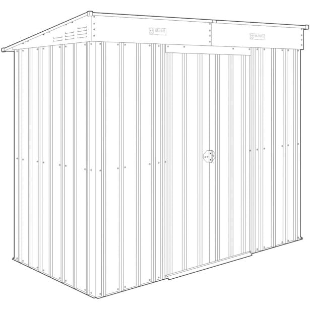 GLOBEL SKILLION 84 je kompaktna, odporna kovinska vrtna hiška optimalna za manjše vrtove ali postavitev ob steno. Ponaša se z ravno streho, visokokakovostno konstrukcijo in enostavnim dostopom preko širokih drsnih vrat.