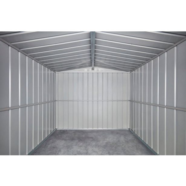 Premium hiška za orodje Tower 86 v srebrni barvi, zaradi svoje višine nudi tudi na samo nekaj kvadratnih metrov veliki osnovni površini veliko prostora za red.