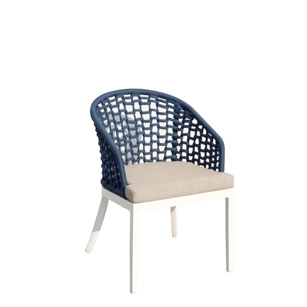 Aluminijasti stol z rokonasloni Aosta v beli in modri barvi z blazino. Vrv iz poliestra. Mere (š/g/v): 56/60/79 cm.