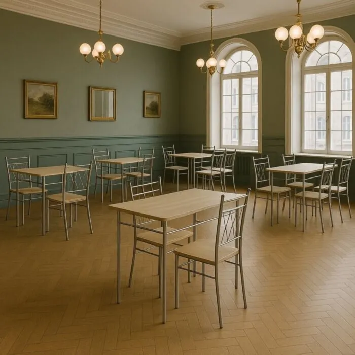Kuhinjska garnitura FALSET je komplet za jedilnico, sestavljen iz mize in štirih stolov. Pohištvo je narejeno iz kvalitetnih materialov. Miza je narejena iz kakovostnega MDF-ja in kovine, ki zagotavlja dodatno stabilnost. Stoli so narejeni iz kovine ter MDF-ja. S svojo eleganco se odlično poda v vašo jedilnico.