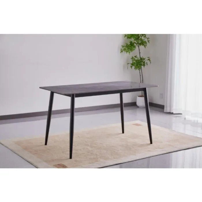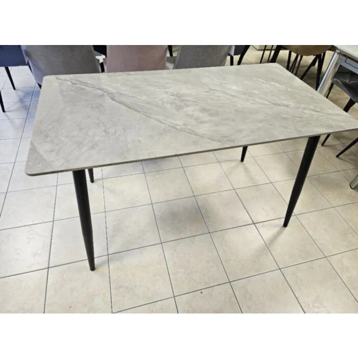 Kuhinjska jedilna miza SANIE je primerna za vsako jedilnico, saj bo s svojim elegantnom izgledom vnesla svežino v vsak prostor. Popestrila bo vsak obrok s svojim prefinjenim izgledom. Zaradi svojega dizajna je primerna za industrijski stil ali pa domači stil. Mizna plošča je narejena iz sintranega kamna 12mm debeline. V sivi visoki sijaj barvi v videzu marmorja. Noge pa so metalne v črni barvi.