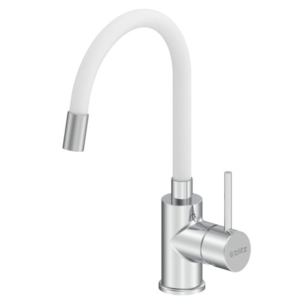 Kuhinjska armatura Blitz K 910M Flex za pomivalno korito s silikonsko izlivno cevjo v beli barvi.