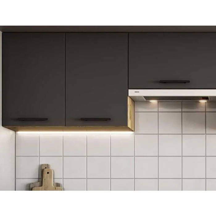 Kuhinjski blok ARIA 240 cm je dobavlja v antracit/hrastbarvi. Korpusi so iz laminirane plošče debeline 16 mm. Laminirane plošče so najpogosteje izbran material za kuhinjske omare zaradi enostavnega čiščenja, kot tudi visoko odpornost na mastne madeže. Ročaji so plastični.
