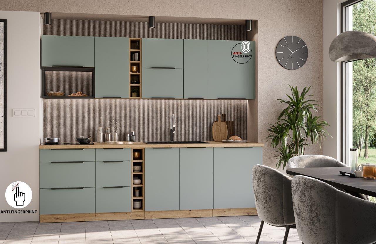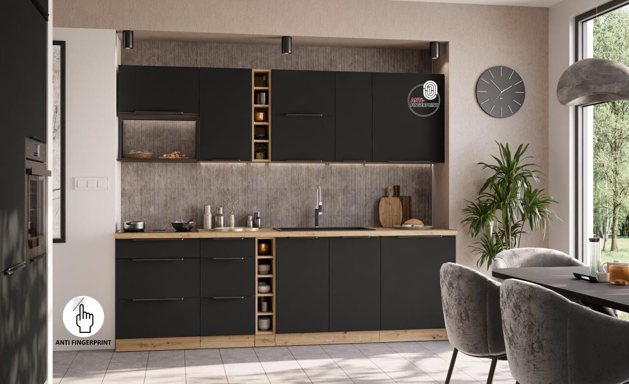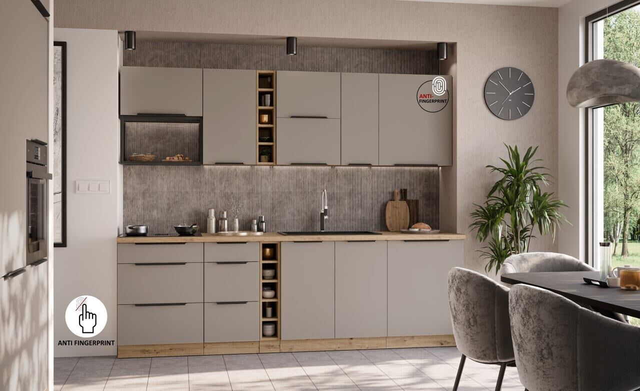 Kuhinjski blok ARIANA 255 cm je elegantna kuhinja v več barvnih kombinacij. Kuhinja je izdelana iz oplemenitenih ivernih plošč debeline 16 mm, prevlečenih z dekorjem, kateri jo ščiti pred vlago. Prav tako imajo plošče visoko odpornost na praske in na prste odtise. Debelina delovnega pulta je 38 mm. Ročaji so iz aluminija. Kuhinjski blok združuje moderen in klasičen videz, zato se odlično poda v vsako kuhinjo.