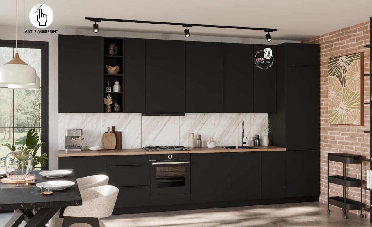 Kuhinjski blok ARIANA 390 cm je elegantna kuhinja v več barvnih kombinacij. Kuhinja je izdelana iz oplemenitenih ivernih plošč debeline 16 mm, prevlečenih z dekorjem, kateri jo ščiti pred vlago. Prav tako imajo plošče visoko odpornost na praske in prstne odtise. Debelina delovnega pulta je 38 mm. Ročaji so iz aluminija. Kuhinjski blok združuje moderen in klasičen videz, zato se odlično poda v vsako kuhinjo.