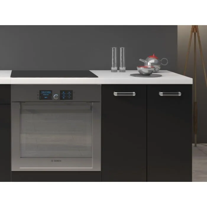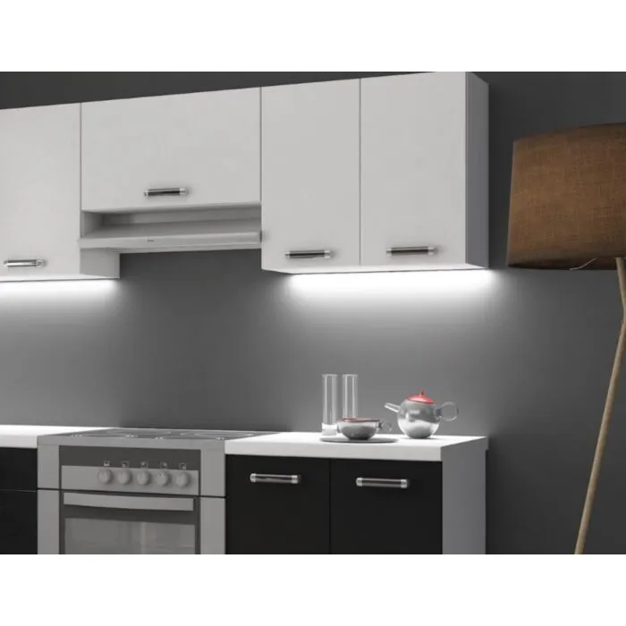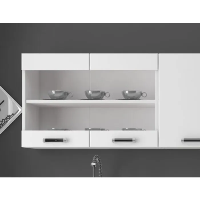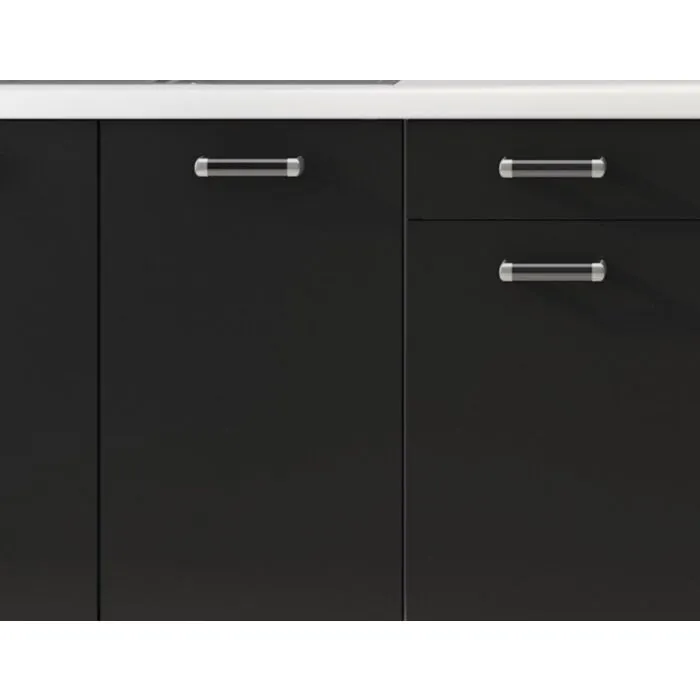 Kuhinjski blok DELTA 2 240 cm je dobavljiva v črnobeli mat barvi. Korpusi so iz laminirane plošče debeline 18 mm. Vrata steklene viseče omarice so iz kaljenega stekla. Kuhinja ima ABS rob. Ročaji so iz pvc-ja.