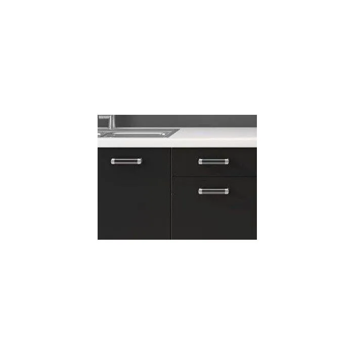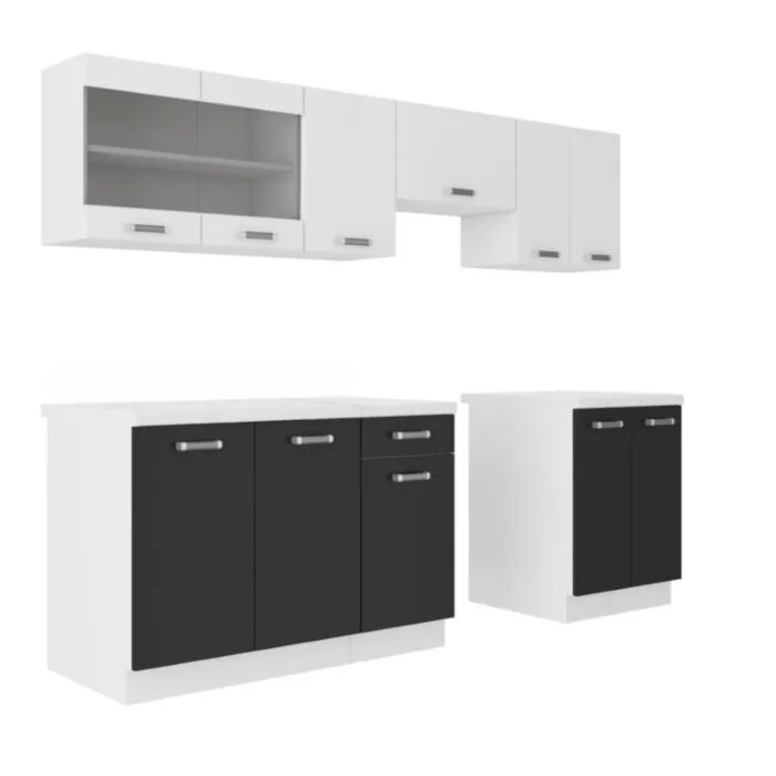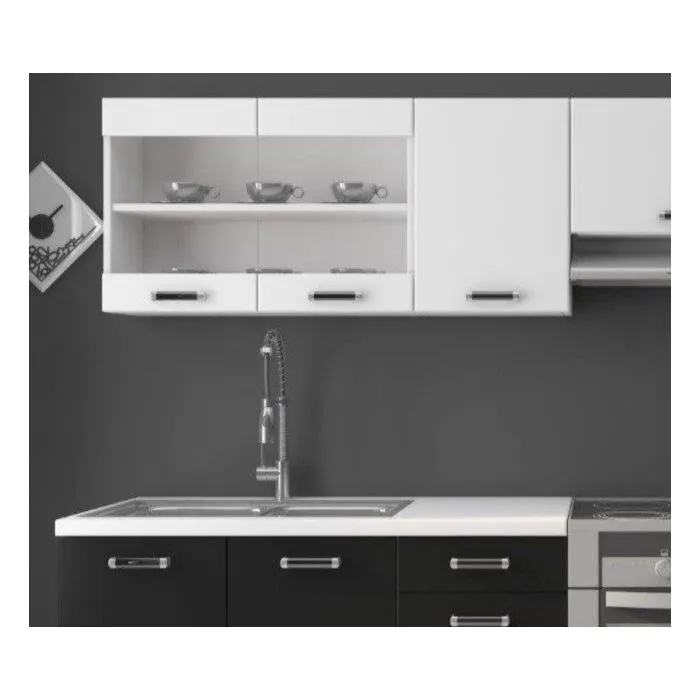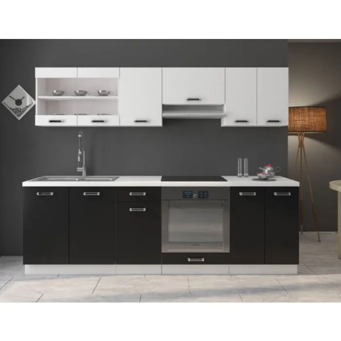 Kuhinjski blok DELTA 240 cm je dobavljiva v črno- beli barvi. Korpusi so iz laminirane plošče debeline 18 mm. Vrata steklene viseče omarice so iz kaljenega stekla. Kuhinja ima ABS rob. Ročaji so iz pvc-ja.
