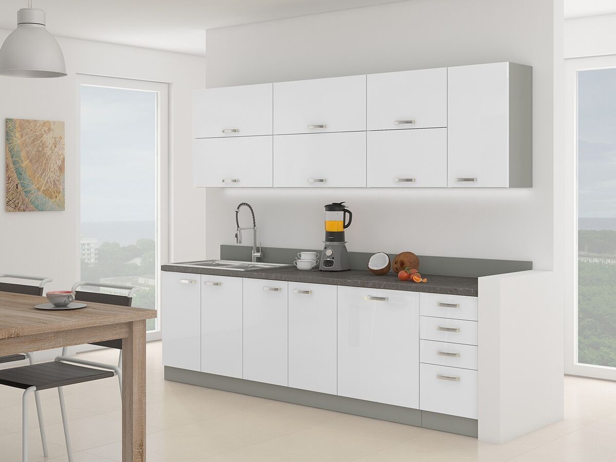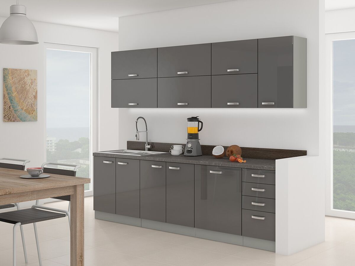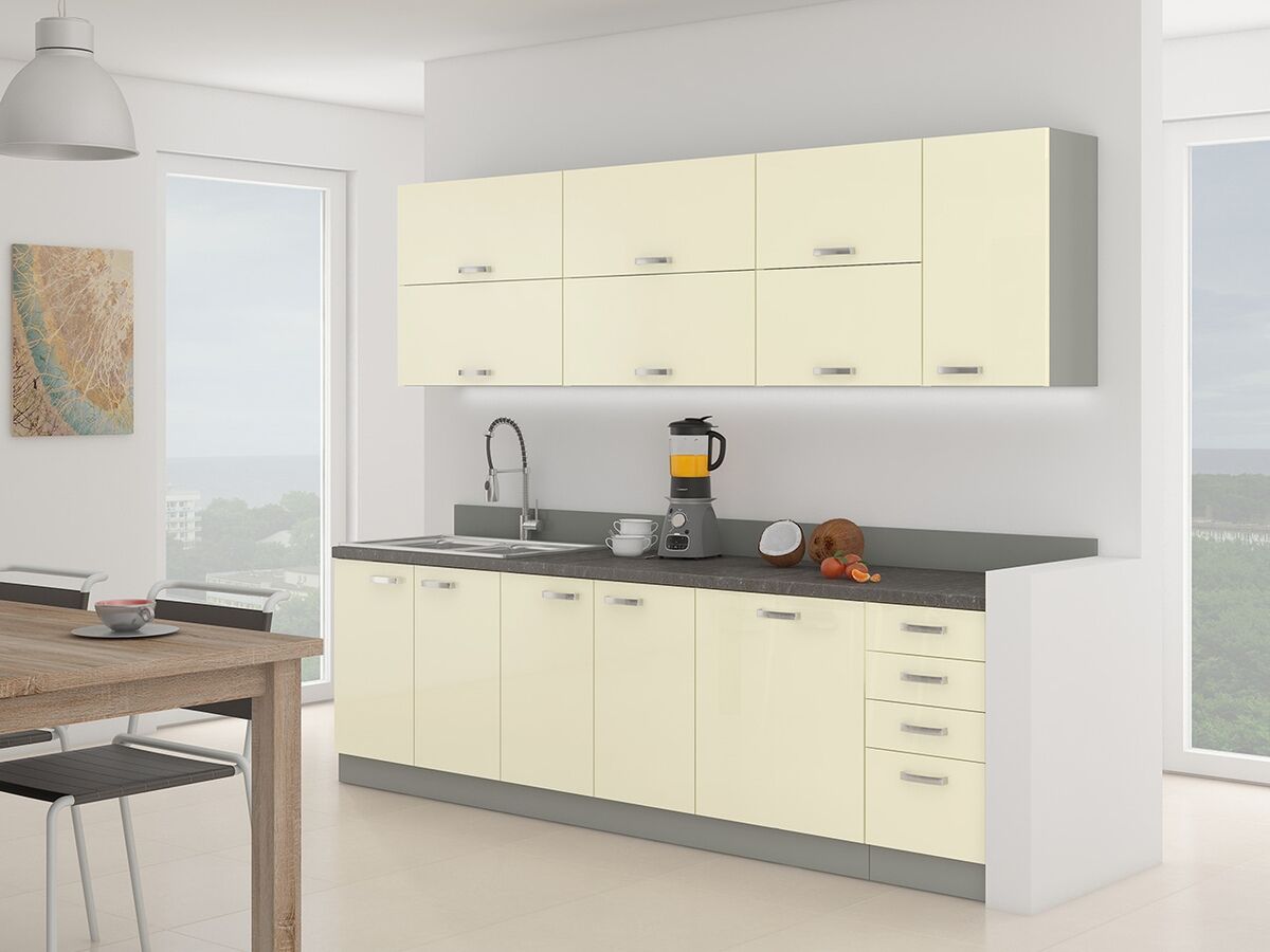 Kuhinjski blok ELITE 260 cm je dobavljiv v več barvah. Debelina delovnega pulta je 28 mm. Kuhinja je izdelana iz oplemenitenih ivernih plošč debeline 16 mm in je oblečena v dekor, kateri jo ščiti pred vlago. Prav tako imajo plošče visoko odpornost na praske. Možnost naročanja dodatnih elementov. Kuhinja ima mehko zapiranje na vratih in predalih.