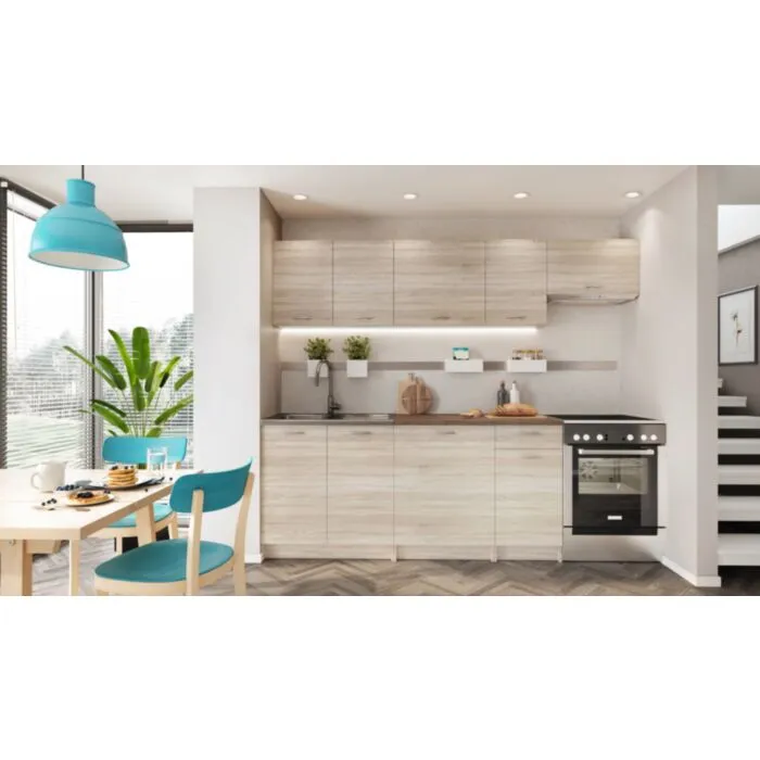 Kuhinjski blok ELLA 240 cm je dobavljiv v sonoma barvi. Korpusi so iz laminirane plošče debeline 16 mm.
