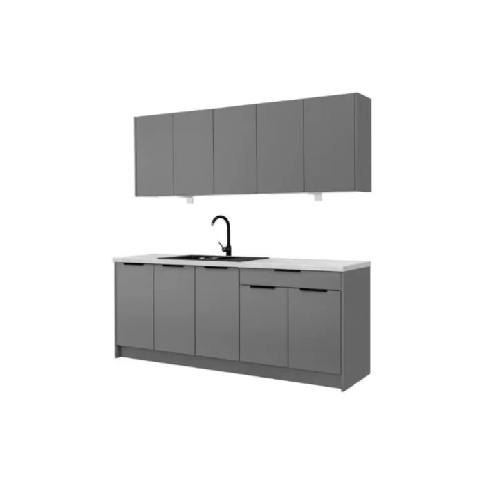 Kuhinjski blok JAGODA 200 cm je modernega dizajna v sivi mat barvi. Stranice so narejene iz laminirane plošče debeline 16 mm, fronte pa debeline 18 mm. Kuhinja vsebuje ABS robove 0,8 mm ter mehko zapiranje. Predal je kovinski.Spodnje omarice imajo plastične nogice višine 10cm, ki so nastavljive na +/- 2,5 cm. Ročaji so metalni v črni barvi. Pult (po želji) je debeline 38 mm v črni marmor barvi. Vrstni red kuhinjskih elementov je lahko poljuben.