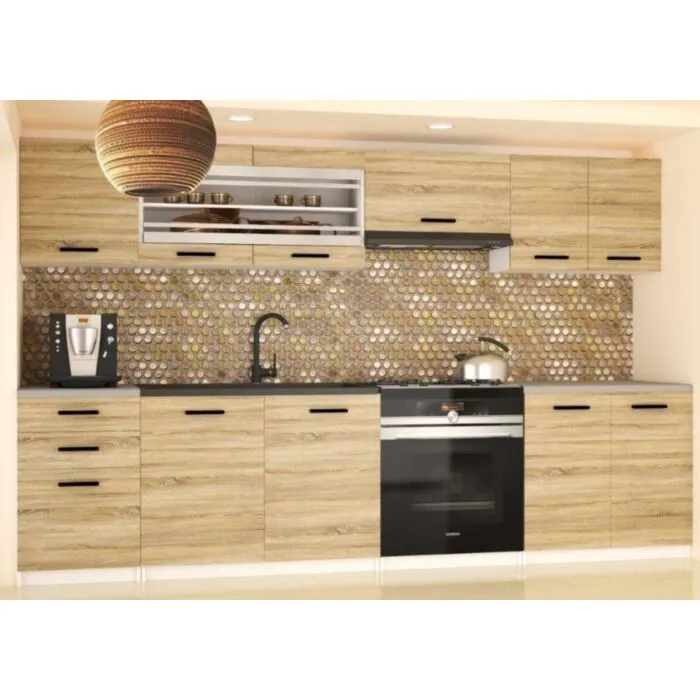 Eleganten kuhinjski blok MARY, ki bo zagotovo osvežil vašo kuhinjo. Dobavljiv je v različnih barvah kuhinjskih elementov. Delovni pult ni v enem kosu. V ceno je vključen le leseni del kuhinje. Možnost je naročiti sistem za mehko zapiranje vrat. Predali pa nimajo možnosti mehkega zapiranja. Debelina kuhinjskega pulta je 3cm. Vsi ročaji so v črni barvi. Globina spodnjih omaric je 45 cm.