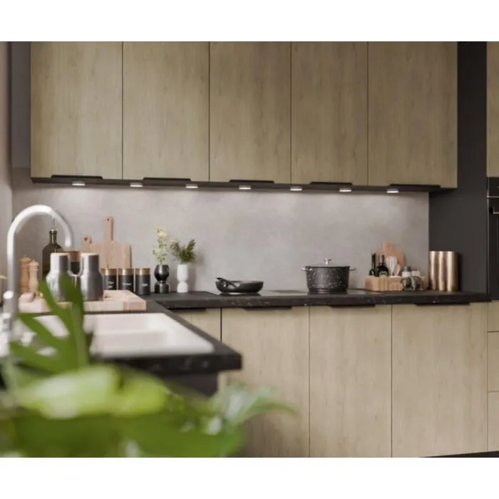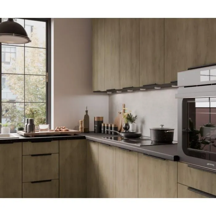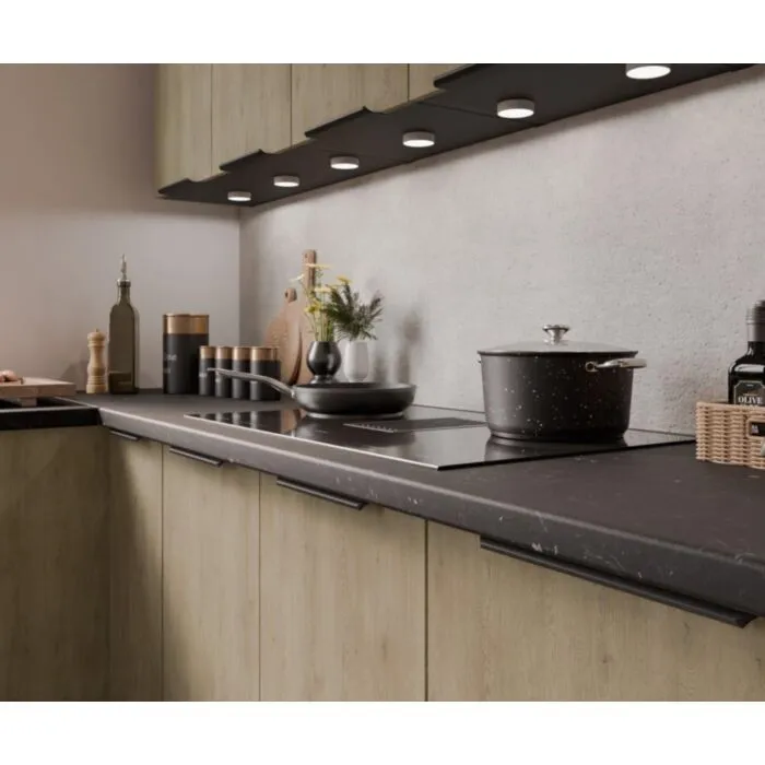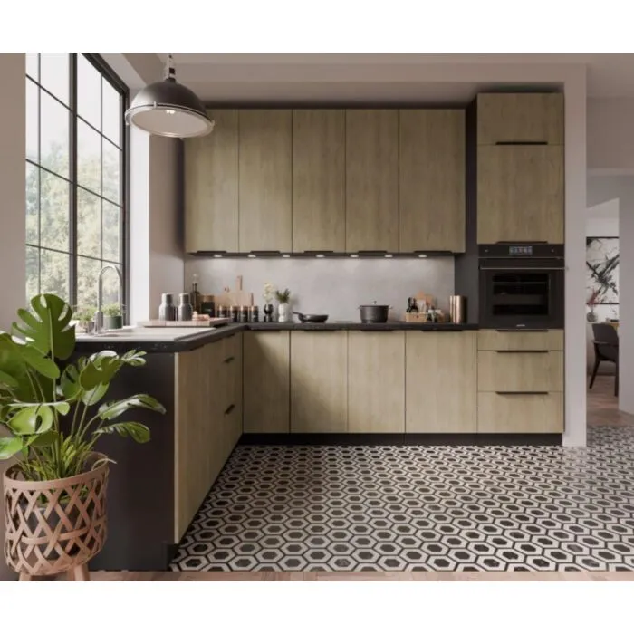 Kuhinjski blok MONIKA 210×290 cm je elegantna kuhinja v kombinaciji hrasta in črne barve. Kuhinja je izdelana iz oplemenitenih ivernih plošč debeline 16 mm, prevlečenih z dekorjem, kateri jo ščiti pred vlago. Prav tako imajo plošče visoko odpornost na praske. Debelina delovnega pulta je 38 mm. Ročaji so iz aluminija. Kuhinjski blok združuje moderen in klasičen videz, zato se odlično poda v vsako kuhinjo.