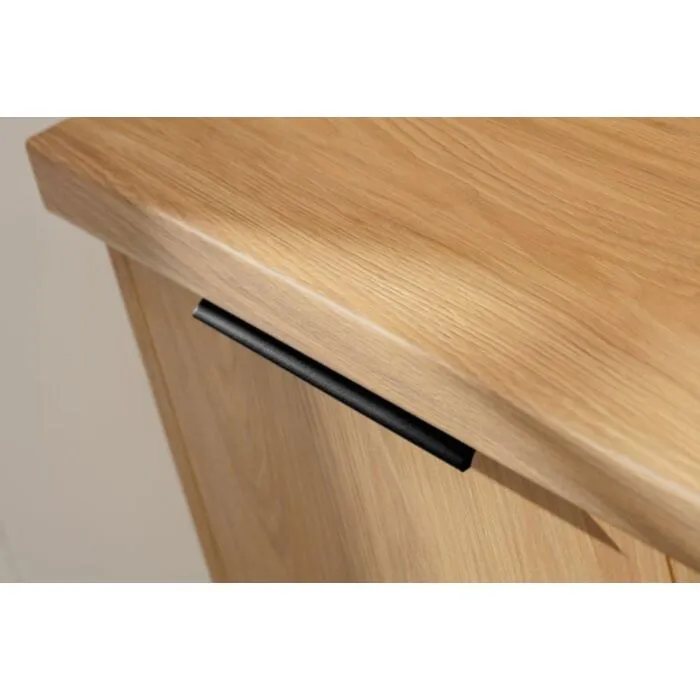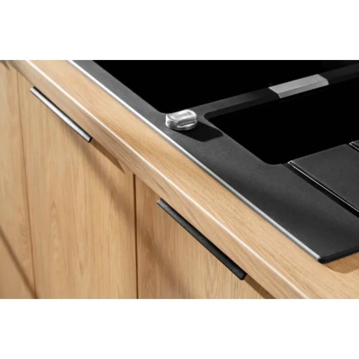 Kuhinjski blok PATRICIA 200 cm je modernega dizajna v hrast / kašmir barvi. Stranice so narejene iz laminirane plošče debeline 16 mm, fronte pa debeline 18 mm. Kuhinja vsebuje ABS robove 0,8 mm ter mehko zapiranje. Predal je kovinski.Spodnje omarice imajo plastične nogice višine 10cm, ki so nastavljive na +/- 2,5 cm. Ročaji so metalni v črni barvi. Pult (po želji) je debeline 38 mm katerega barvo lahko izberete. Vrstni red kuhinjskih elementov je lahko poljuben.