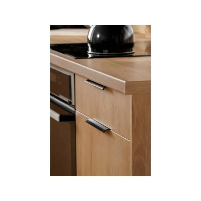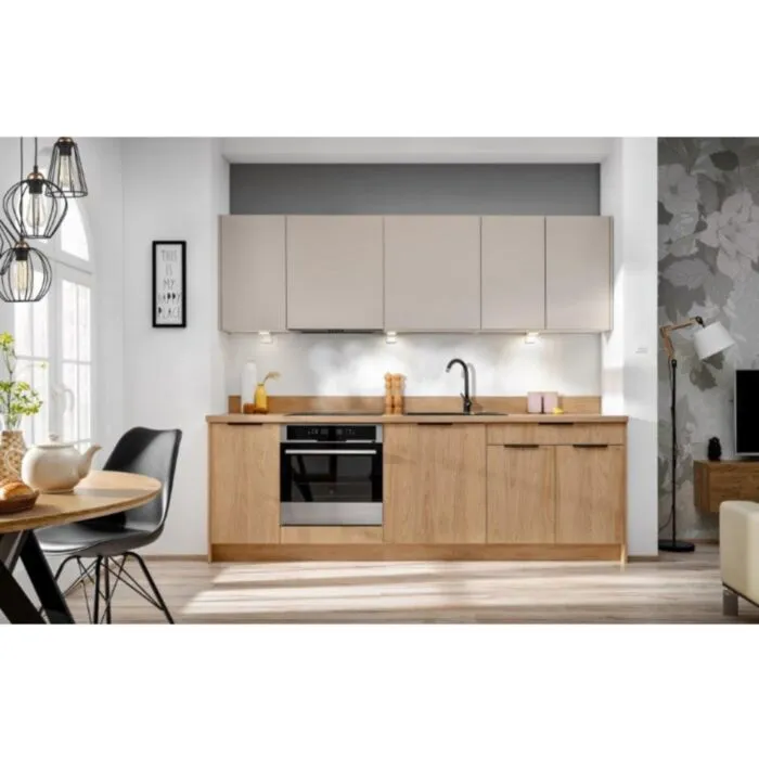 Kuhinjski blok PATRICIA 240 cm z vgradnimi aparati, je modernega dizajna v hrast / kašmir barvi. Stranice so narejene iz laminirane plošče debeline 16 mm, fronte pa debeline 18 mm. Kuhinja vsebuje ABS robove 0,8 mm ter mehko zapiranje. Predal je kovinski.Spodnje omarice imajo plastične nogice višine 10cm, ki so nastavljive na +/- 2,5 cm. Ročaji so metalni v črni barvi. Pult je debeline 38 mm v hrast barvi. V ceno sta vključeni 2 x dodatni spodnji stranski zaključni stranici, kakor na sliki.