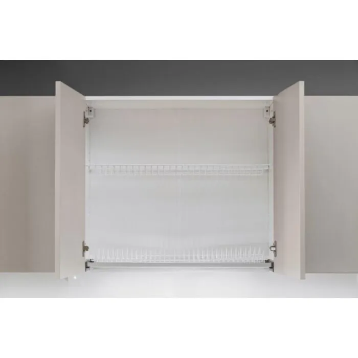 Zgornja omarica 80 cm vsebuje police. Po želji pa se lahko dokupi za doplačilo 30€ odcejevalno omarico za krožnike. Kakor je prikazano na sliki pri odprti omarici.