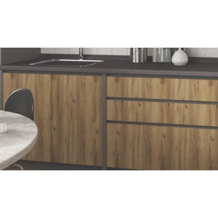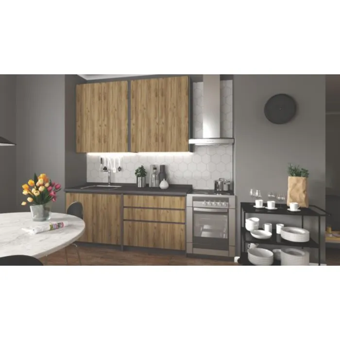 Kuhinjski blok RAFFERTY 180 cm je dobavljiv v oreh barvi. Korpusi so iz laminirane plošče debeline 16 mm. Laminirane plošče so najpogosteje izbran material za kuhinjske omare zaradi enostavnega čiščenja, kot tudi visoko odpornost na mastne madeže. Ročaji so plastični.