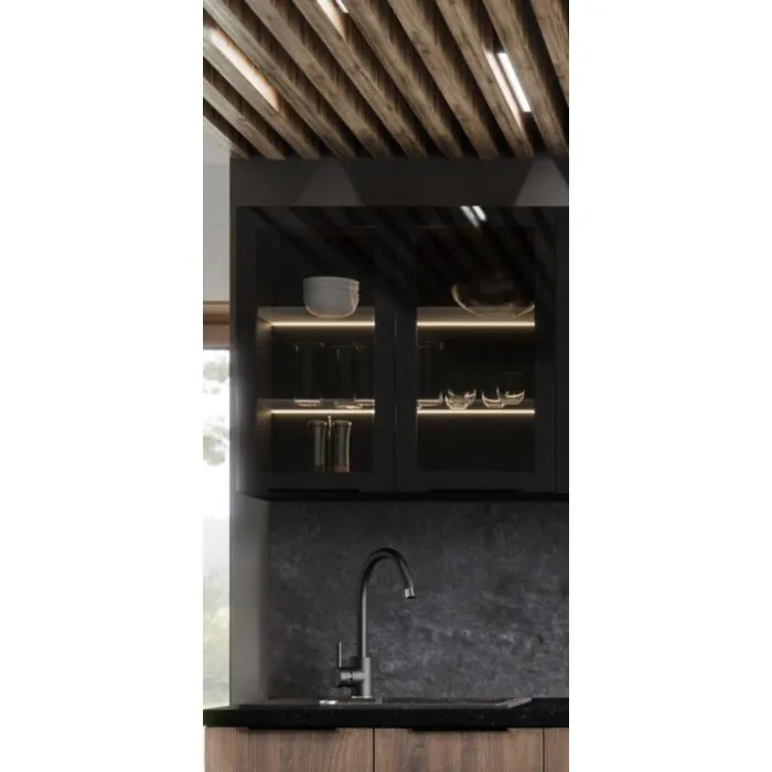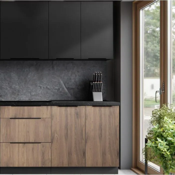 Kuhinjski blok SARA 260 cm je kuhinja v kombinaciji črne mat in oreh barve. Kuhinja je izdelana iz oplemenitenih ivernih plošč debeline 16 mm in je oblečena v dekor, kateri jo ščiti pred vlago. Prav tako imajo plošče visoko odpornost na praske. Debelina delovnega pulta je 38 mm. Ročaji so iz aluminija. Kuhinjski blok je modernega/klasičnega videza zato se bo prilegal v vsako kuhinjo.