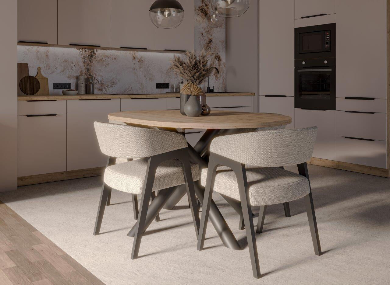 Kuhinjski blok SOLA 310×180 cm je kuhinja v kombinaciji hrasta in kašmir barve Kuhinja je izdelana iz oplemenitenih ivernih plošč debeline 16 mm in je oblečena v dekor, kateri jo ščiti pred vlago. Prav tako imajo plošče visoko odpornost na praske. Debelina delovnega pulta je 38 mm. Ročaji so iz aluminija. Kuhinjski blok je modernega/klasičnega videza, zato se bo prilegal v vsako kuhinjo.